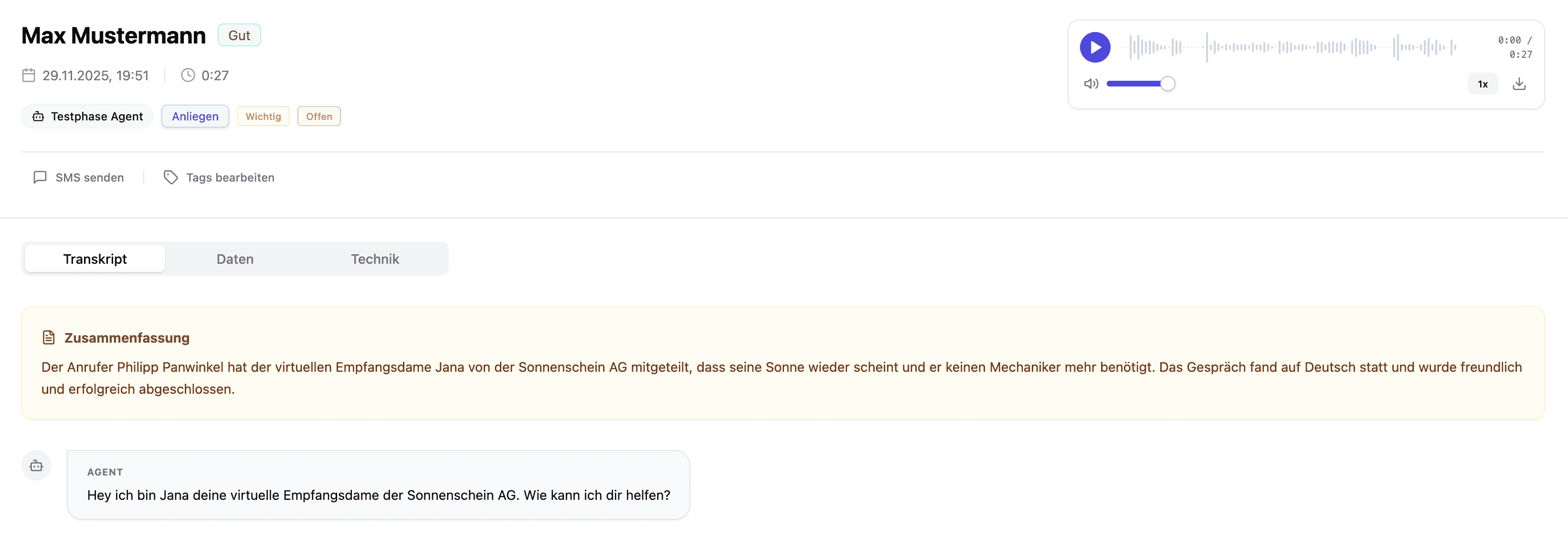 Sobald dein KI-Telefonassistent aktiv ist, siehst du in Echtzeit, worüber gesprochen wird und wie gut die Telefonate laufen. Inklusive Transkript, Audioaufzeichnung und Zusammenfassung.